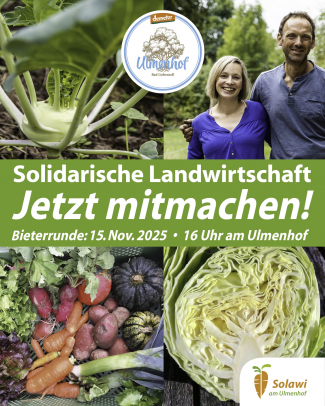 Wir laden alle Interessierte herzlich ein, sich der Solawi-Idee anzuschließen, bei der Bieterrunde mitzumachen und sich für 2026 leckeres Demeter-Gemüse aus der Region vom Ulmenhof zu sichern.